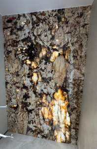 Kamienie podświetlane led charakteryzują się równomiernym rozproszeniem światła, podkreślają wyjątkową strukturę kamienia z jego przebarwieniami i żyłkowatością, eksponując wszystkie kolory niemożliwe do uzyskania innymi metodami. Kamienie podświetlane możemy stosować jako elementy umocowane na ścianie, jako blaty kuchenne, blaty i ściany w łazienkach i toaletach. Dzięki ograniczeniu grubości kamień wraz z podświetleniem nie zmienia realnie wymiarów pomieszczenia. Nasze podświetlenia dostosowujemy do indywidualnych potrzeb i mogą być zaadaptowane do każdego wnętrza. Charakteryzują się niskim zużyciem energii i długą żywotnością.